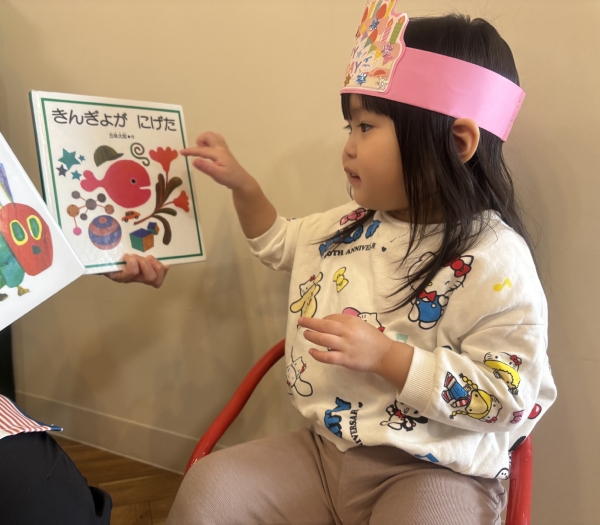 2つの絵本を用意すると「きんぎょがにげた」の絵本を選び嬉しそうな様子♡